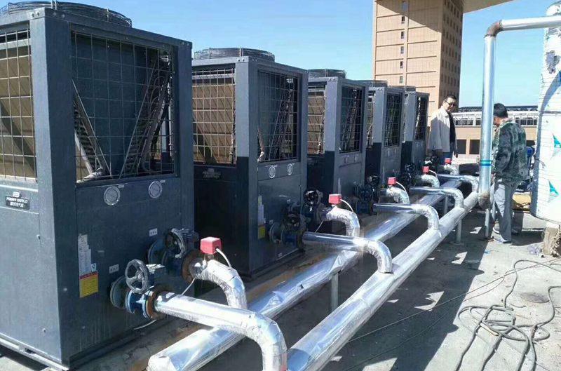 2019年下半年,工程项目改建工作正式开展,按照工程项目的采暖要求,安装了5台50P的超低温采暖空气能热泵机组,另外配备了2个循环水泵,总功率为15kW。为了确保系统的运行稳定性,工程项目还安装了一个2吨的承压缓冲水箱。空气能热泵机组安裝在原先锅炉房的屋顶,主管道和室内末端都利旧,空气源热泵热源侧管道与主管道做好对接。室外和设备间所有的管道全部采用5公分的发泡保温,外面用铝皮包裹,保证采暖的效果。另外,室外管道全部采用槽钢支架支撑,电线也全部安装在不锈钢钢槽里面。