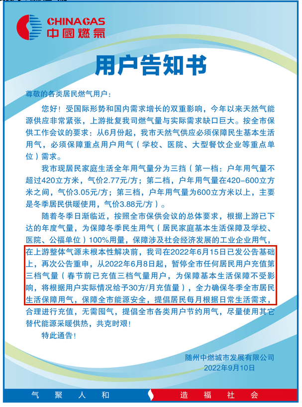 据该通告显示,从2022年6月8日起,暂停随州任何居民用户充值第三档气量,全力确保冬季全市居民生活保障用气,保障全巿能源安全,提侣居民每月根据日常生活需求,合理进行充值,无需回气。