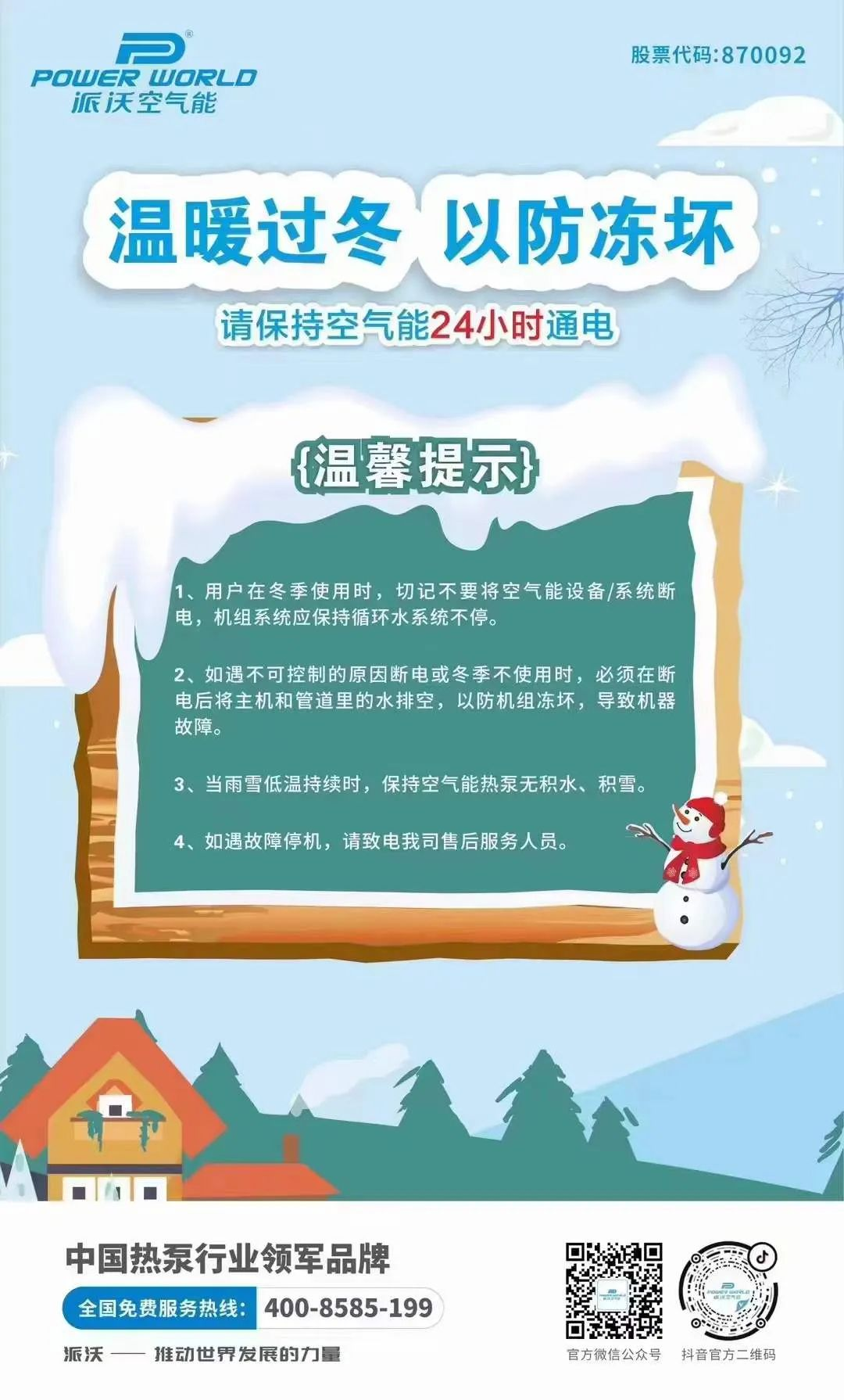 空气源热泵制热是以水作为中间介质进行热量的传递,如果天气温度比较低,一旦切断空气能机组电源,就有可能导致管路内的大量水流温度急剧下降,温度过低的话,就有可能冻坏设备,导致设备出现故障。