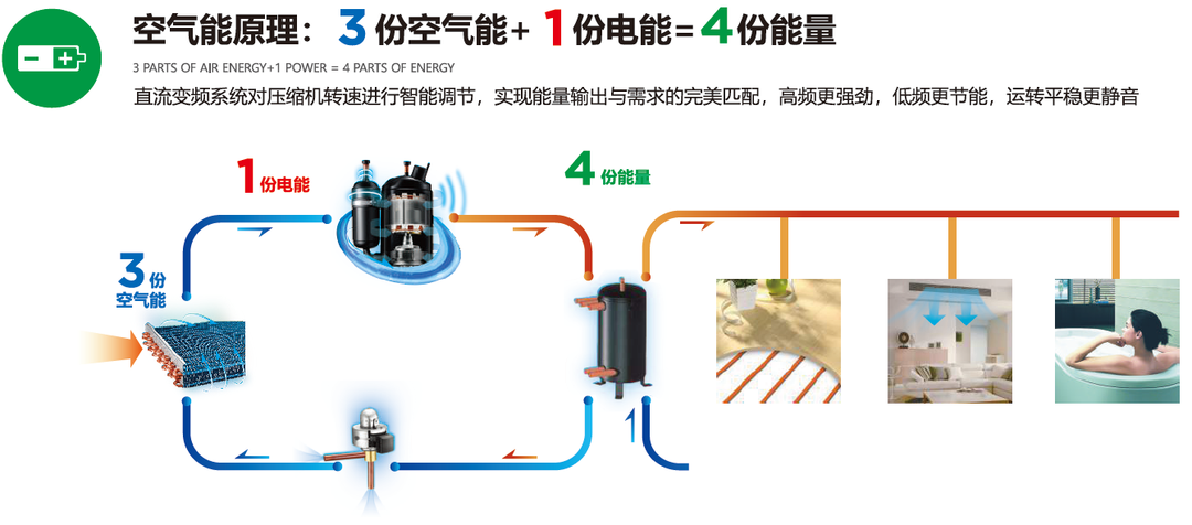 在地球的大气层中,储存了大量能量,比如太阳能,以及城市、生物体、燃料燃烧排放后的热能。而空气能热泵就是从空气中获取这些难以利用的低品位热能,通过电能做功,提供可为人们所用的高位热能的装置,是一种绿色清洁的新能源科技设备。
