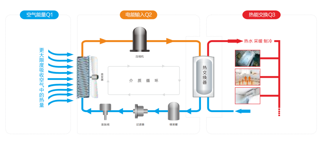 热泵的工作原理就是以逆循环方式迫使热量从低温物体流向高温物体的机械装置。空气能热泵在工作时,首先是输入1份电能,驱动压缩机做功,然后从外界环境温度中再吸收大量的热能,通过冷媒循环系统在冷凝器中进行放热。它仅消耗少量的逆循环净功,就可以得到较大的供热量,可以有效地把难以应用的低品位热能利用起来达到节能目的。