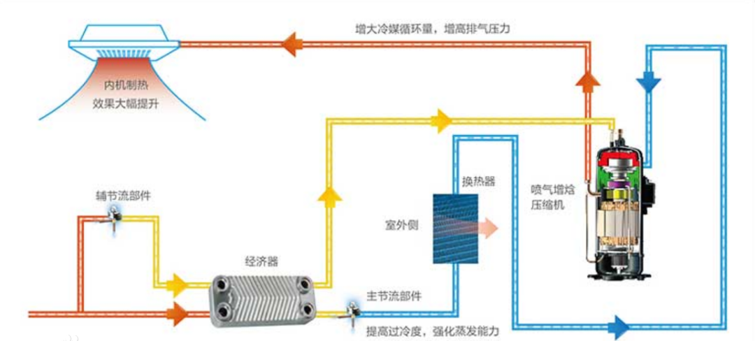 那么空气能是如何解决这个问题呢?针对低温性能下降的应对措施的其中一点就是“喷气增焓技术”的应用。