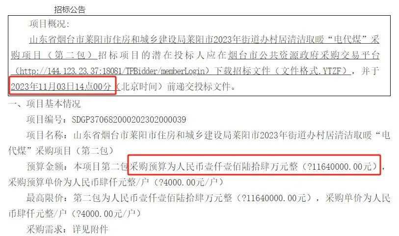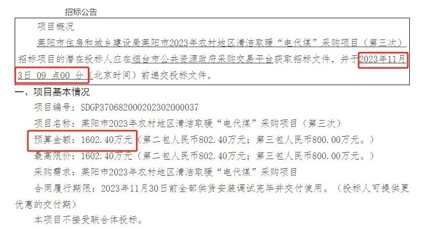 莱阳市2023年农村地区清洁取暖“电代煤”项目“第三次”招标公告,预算金额:1602.40万元!